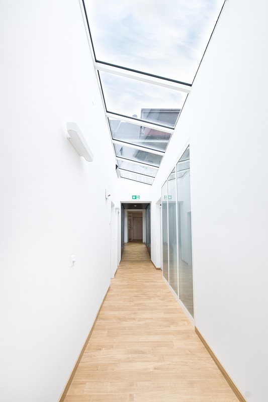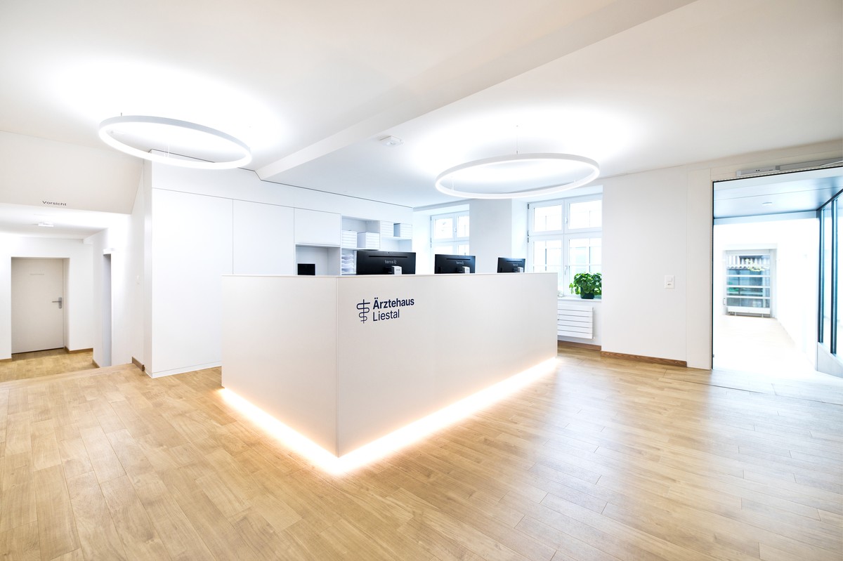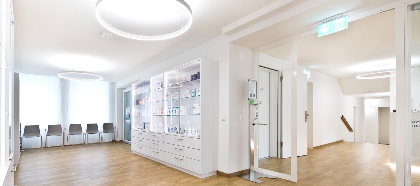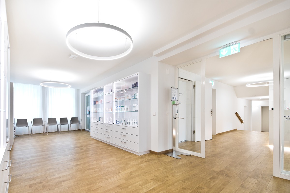 Auf einer Fläche von 575 Quadratmetern bietet unsere Praxis moderne, grosszügig gestaltete Räumlichkeiten, die auf Komfort, Funktionalität und Effizienz ausgerichtet sind. Dazu zählen ein einladender Empfangsbereich, ein angenehm gestaltetes Wartezimmer, sieben helle Sprechstundenzimmer sowie mehrere Patienten-WCs und eine Duschmöglichkeit.